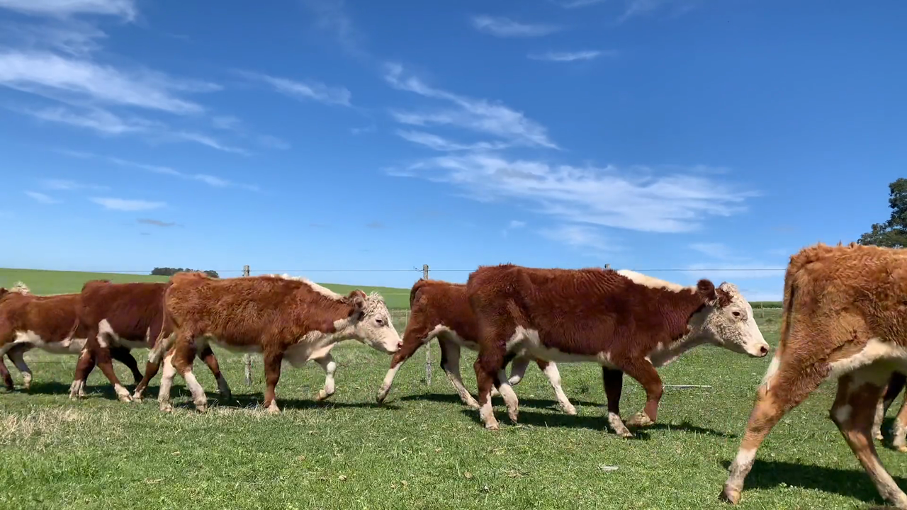 Buen lote de vaquillonas Hereford de clase buena muy buena. Ganado de lindo biotipo y de buen sello racial. Tienen buenas conformaciones carniceras y buenas estructuras oseas. Vaquillonaje que esta vacio por ecografia la cual se realizo el dia de la certificacion. Son mansas, sanas y bien trabajadas. Por denticion son:18%DL, 24% 2D, 43% 4D y 15% 6D. Lote bastante homogeno excepto 5 que pesan menos de 240kg el reste esta entre los 241kg y 305kg. BUENA REPOSICION